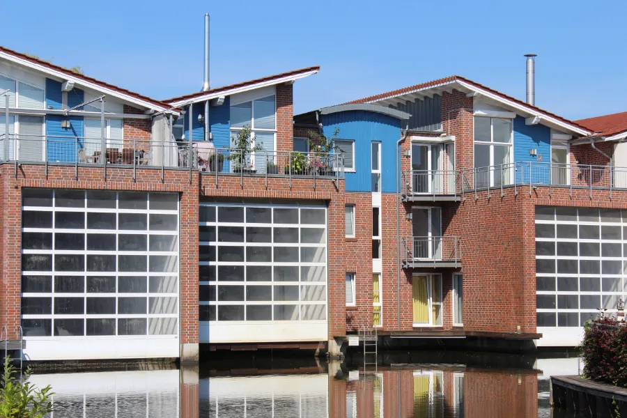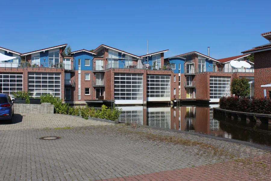 Wohnen und Leben am Wasser. Vom Vorentwurf bis zur Ausführungsplanung (Leistungsphase 1-5 der Honorarordnung - HOAI - in Teilen), Neubau von 45 Wohneinheiten mit Bootsgaragen, sowie einem Servicecenter für die EOC Immobilie GmbH & Co. KG in Kluse-Steinbild.
